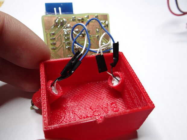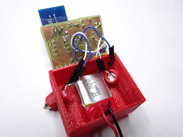 Después de hacer un PCB y la impresión te pueden empezar a Asamblea. Lo primero es hacer un pequeño agujero en la parte delantera del chasis con el archivo. Este es el agujero para los cables de la batería. Ahora usted puede poner sus motores en los agujeros, no olvide comprobar el sentido de la misma. A continuación, puede poner una batería bajo los motores y cerrar con PCB.
