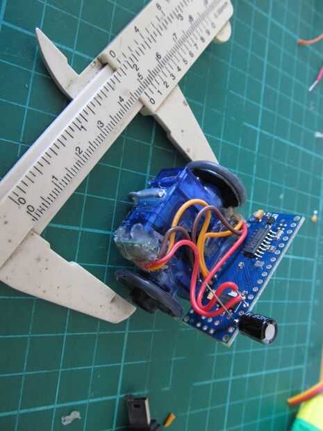 - Un gran condensador entre masa y energía. La mía es 470uF, 10V. Esto evita brown-outs cuando los motores en marcha. Mantener las piernas largas por lo que se pueden soldar a otros dispositivos a la misma.