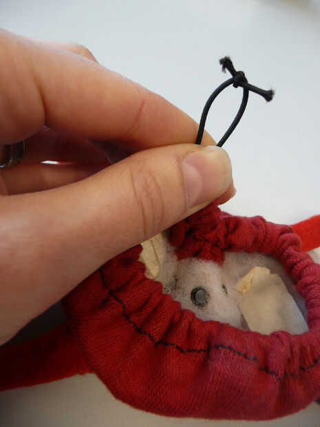 3. Instale un pasador de seguridad en la cuerda elástica y empuje suavemente a través del túnel. Tire del cordón en ambos extremos para arrugas de la piel, creando así una especie de 'Gorro'. Atar los dos extremos juntos.
