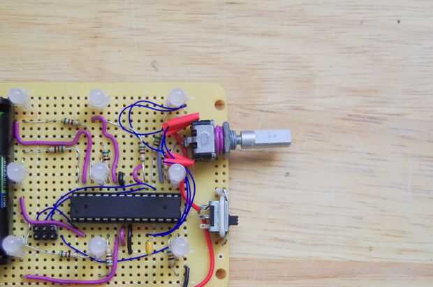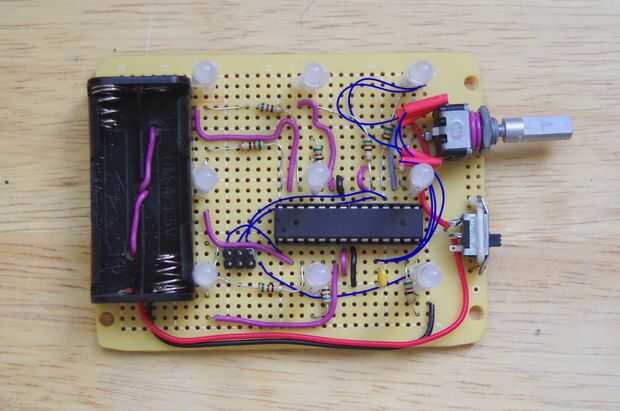 tuve que tratar los bordes de la junta con el archivo para hacerlo caber en el recinto (una caja de Johnson & Johnson equipo de emergencia.). Todos los componentes fueron montados en el tablero de PC y soldados a él. Como se puede ver la densidad de los componentes del proyecto en las juntas no es alta.  Elementos a la Junta de soldadura y la conexión con 26 cable calibre no fue difícil. Para averiguar cómo LED fue orientado en el seguimiento de junta la regla simple: parte superior de cualquier LED en mi diagrama corresponde a la pata más larga del LED.  Contactos del codificador son muy frágiles por lo que aquí utilicé alambre de calibre 30.