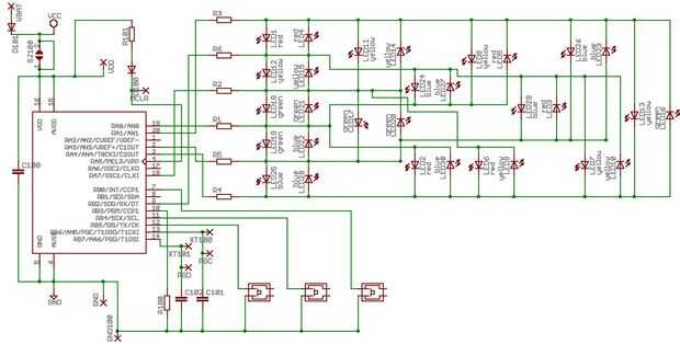 Originalmente tenía intención de utilizar la función de subida débil en Puerto B del 16F88 para salvar a algunos de los componentes, en particular de enderezamiento en las entradas de interruptor. Sin embargo, al componer la Junta he asignado una de la charliegrid líneas de control a otro pin en PortB. Esto fue una decisión de diseño sencillo, más fácil de diseño de la Junta en un espacio tan pequeño moviendo los rastros a las clavijas más accesibles en el PCB. Si tienes suficiente espacio en todas las líneas de controles charliegrid habían conectado al mismo puerto.