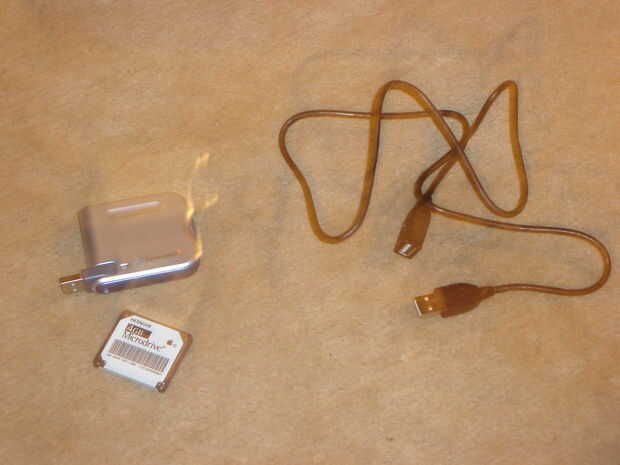 • Lector de tarjetas CF. $14,99 en cualquier tienda de informática. Asegúrese de que es compatible con tipo II. Microdrives son tipo II, los más delgados son TypeI. Sólo asegúrese de que tiene los pins de adentro para atacar a los agujeros en el microdrive.