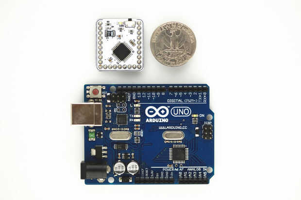 el tamaño del Microduino es como 1,0 x 1.1 pulgadas, al igual que una cuarta parte. es muy pequeño. las cabezas de perno y toma de corriente pueden conectarse stablely, significa que microduino se puede utilizar en un diseño de producción de bajo volumen!