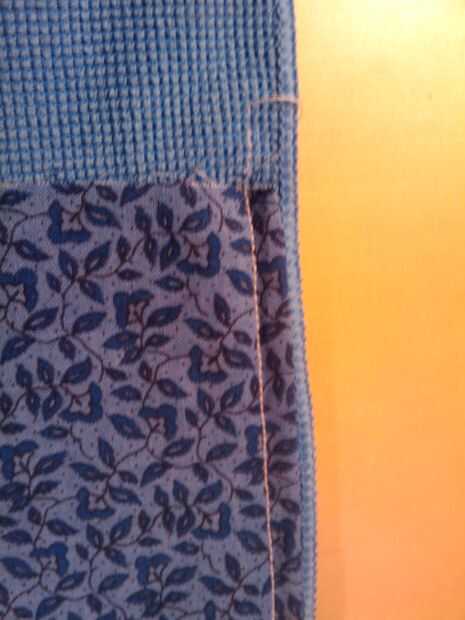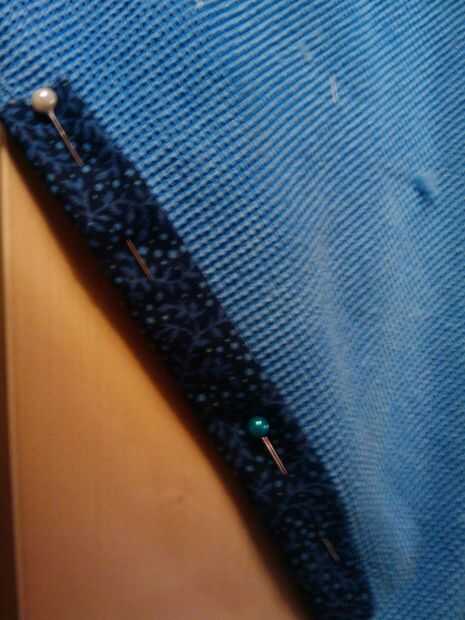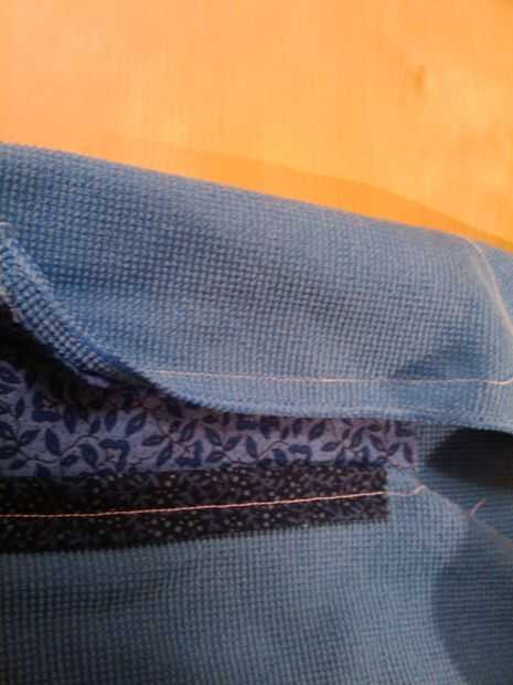 Ahora cosí los extremos de mi paño externo a los extremos de la tela de microfibra. Hice cada extremo diferente. El extremo azul oscuro terminará siendo la parte superior del bolsillo, mientras que el otro extremo será la aleta. Así la tela azul oscurezca fue doblada alrededor del extremo de la microfibra con el borde rodeado por un. El Celeste tenía escondido el borde, pero no abrigo sobre la microfibra. Esta izquierda una aleta pequeña en el extremo donde va el elástico.