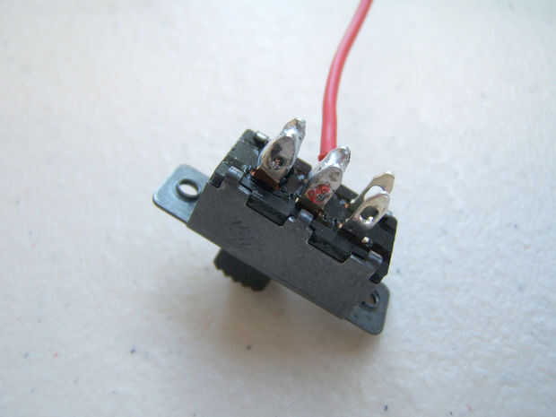 Una buena manera de averiguar cual es la pestaña derecha es averiguar que dos pestañas que el botón deslizante está directamente por encima cuando el micrófono está encendido. Es estas dos lengüetas que necesitan cables conectados a ellos. Uno ya debe tener un cable conectado a él (probablemente el centro de uno). Es la pestaña de fondo que debe tener un cable conectado a ti (ya habría alguna soldadura en el pasador, ya que se corta un alambre de él antes). Si usted es todavía confuso, basta con mirar las fotos abajo.