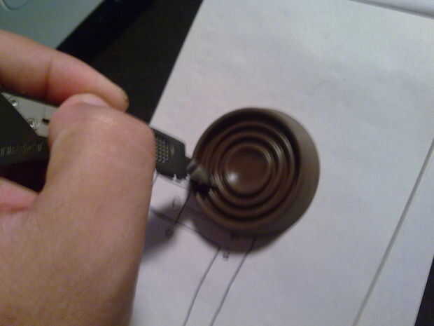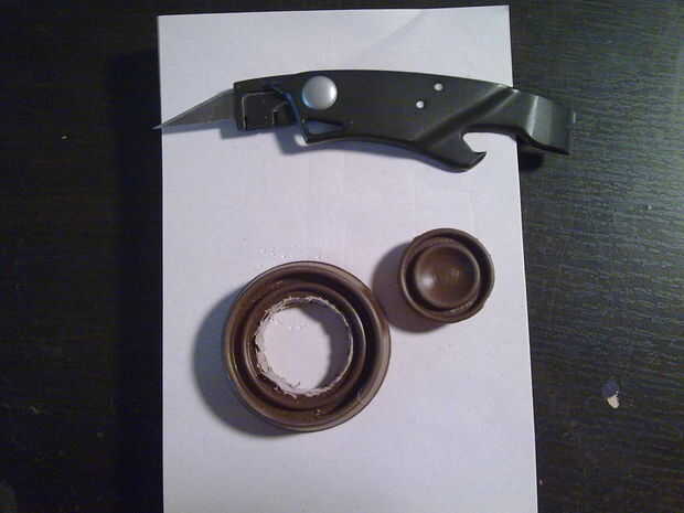 Está bien, está bien. Te diré cómo hacerlo. Esto es donde vamos a utilizar uno de los pies de goma para poner debajo de las patas de la mesa. Estos pies son el diámetro correcto para caber dentro de la pulgada de 1 y 1/2 parte de tapón final de PVC de la cáscara. Todo lo que necesitas hacer es cortar el agujero del tamaño adecuado en una elemento de micrófono encajar en. Por suerte, hay algunos anillos agradables ya estampadas en un lado de la los pies de rrubber que son guías útiles para hacer este corte. En primer lugar, poner elemento de micrófono en la parte superior del pie de goma para ver cual anillo te debe usar como una guía (ver imagen). Luego utilizar una cuchilla multiuso para cortar con cuidado alrededor de este anillo. Usted querrá hacer el agujero un poco más grandes entonces el diámetro del elemento de micrófono. El pie de goma va a conseguir comprimido cuando nos mermelada hacia abajo en la carcasa del micrófono, y si el ajuste es demasiado apretado alrededor del elemento, no habrá espacio para esta compresión. No te preocupes, todo estará muy hermética cuando hemos terminado. Coloque el elemento dentro del agujero que sólo has tallado. Ver las fotos de cómo hacerlo correctamente asentado.