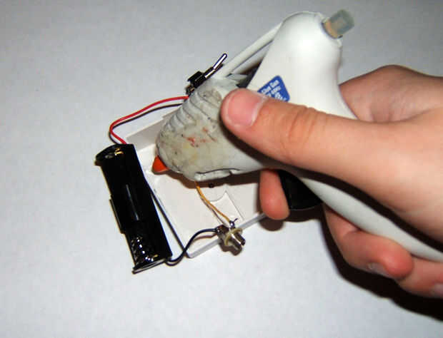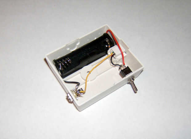 Con tu pistola de pegamento caliente, pegar el portapilas en el interior del caso contrario de los orificios para el interruptor y el conector. Tome las tuercas de su interruptor y jack, poner los dos componentes a través de los agujeros hechos para ellos y atornille las tuercas volver a fijación en el lugar. Clip del sin usar cable rojo y verde.