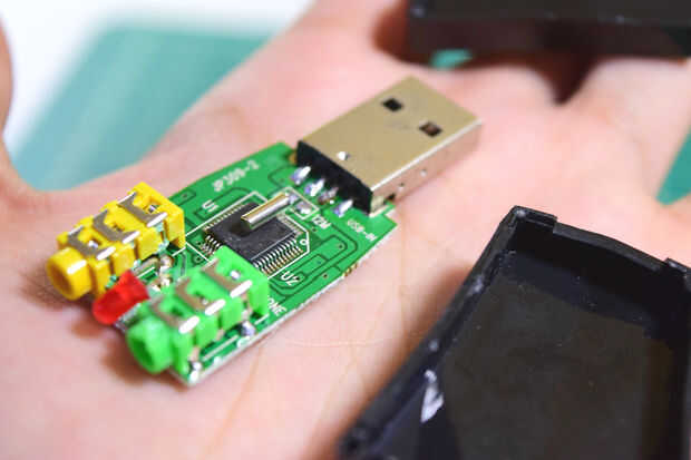 Abra cuidadosamente la caja de la tarjeta de sonido USB. Cualquier cuchillo haría en abrir la caja. Sólo asegúrese de que no golpee los componentes dentro. Ahora desoldar los dos conectores de audio, el LED y el conector USB macho.