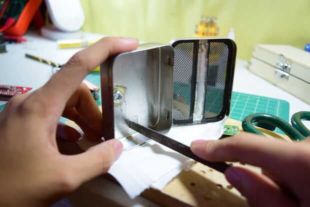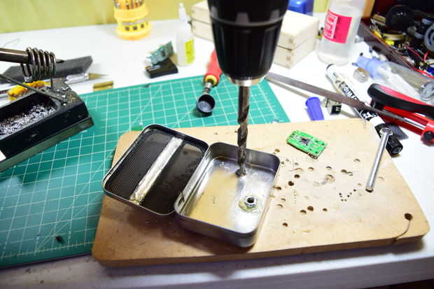 La mejor manera de hacer un agujero cuadrado para el puerto USB es taladrar un agujero de 6,5 mm en el contenedor de Altoids.