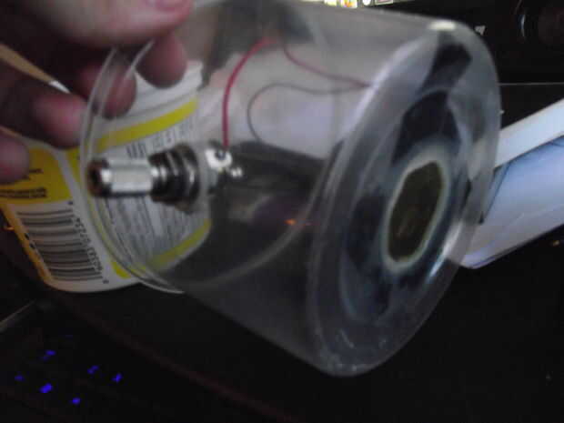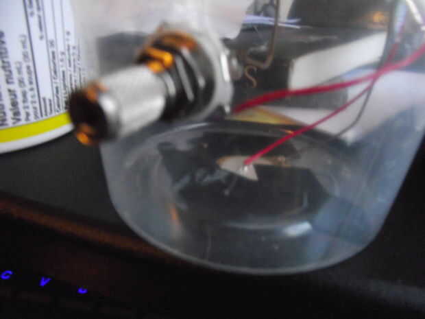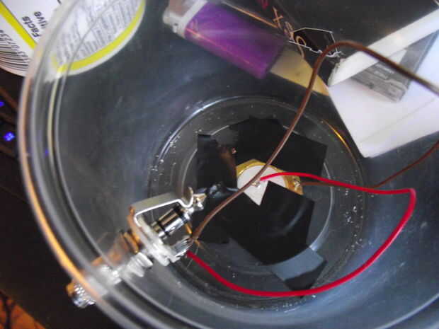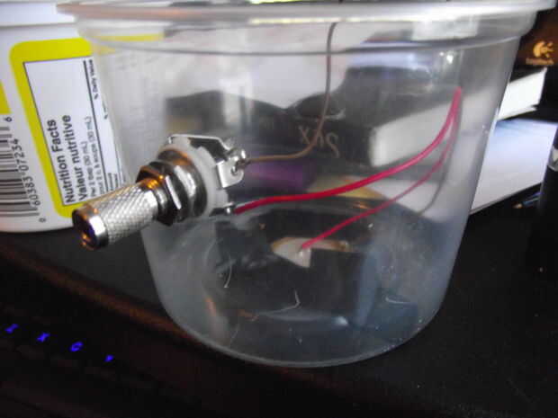 Perforar un agujero en el lado del contenedor para el gato y la parte inferior para el micrófono de contacto, luego fijarse. Su un pedazo áspero pero un prototipo. Ahora usted solo Conecte un cable, conecta el dispositivo de grabación y listo!