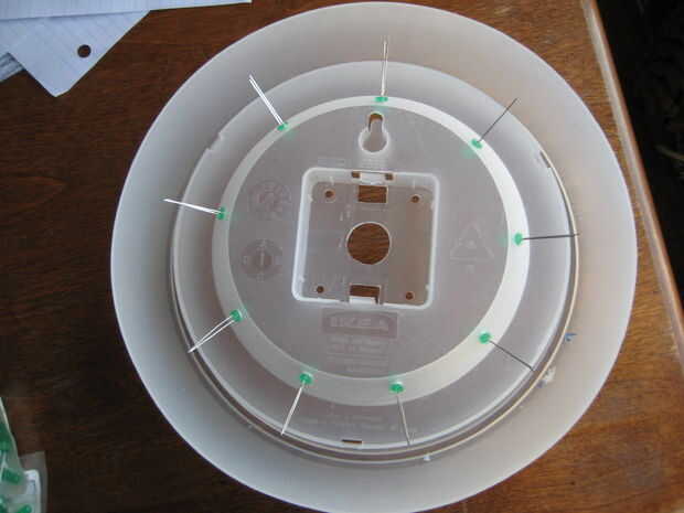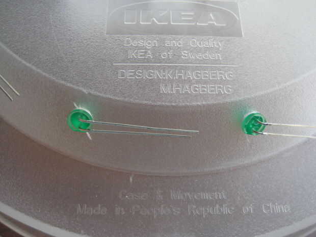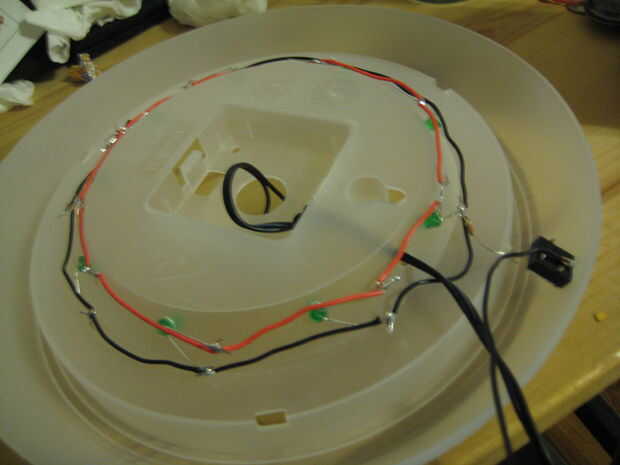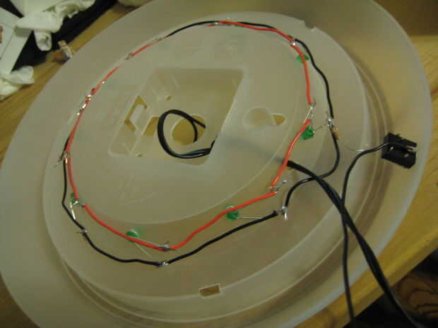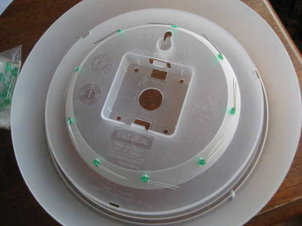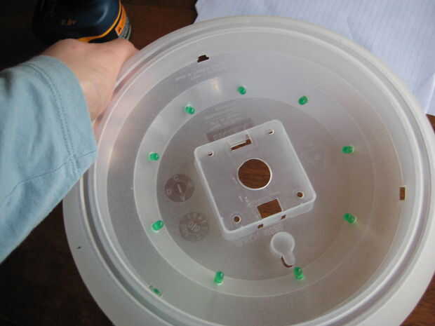Inserte sus LEDs en los agujeros, apuntando hacia el interior de la caja. Alambre todas las clavijas de alimentación más juntos y todos de corto tierra pines juntos.