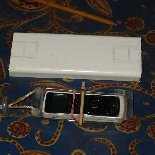Ya había modificado algo del material de empaquetado plástico claro moldeado que la grabadora. Lo hice para que yo pudiera colgar alrededor de mi cuello. Mantuve el botón de grabación empujado por medio de una tuerca deslizante con un palito apretado por una banda de caucho.