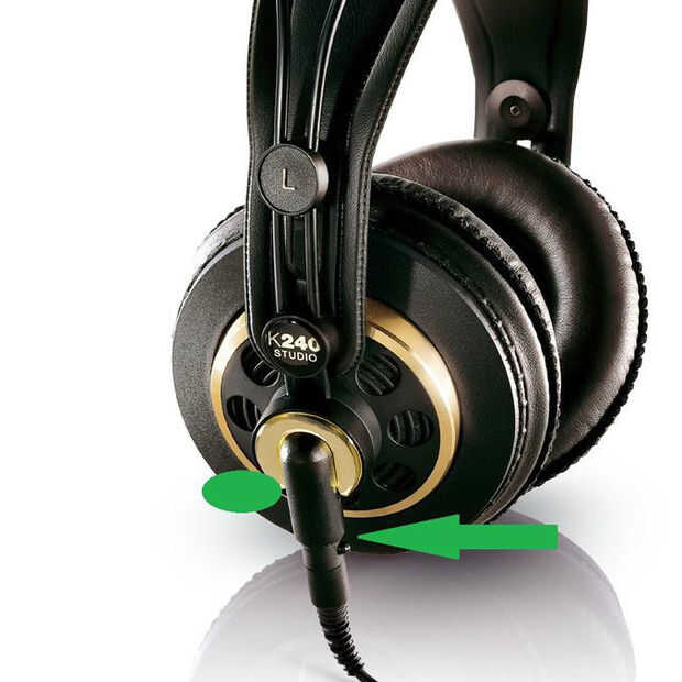 - Ejemplo: en mi K240s de AKG, el material del sujetador que se avanzó en la Copa de oído del oído izquierdo para evitar el conector del cable de K240 (puntos de flecha verde a él). El óvalo verde es donde puse el material sujetador.