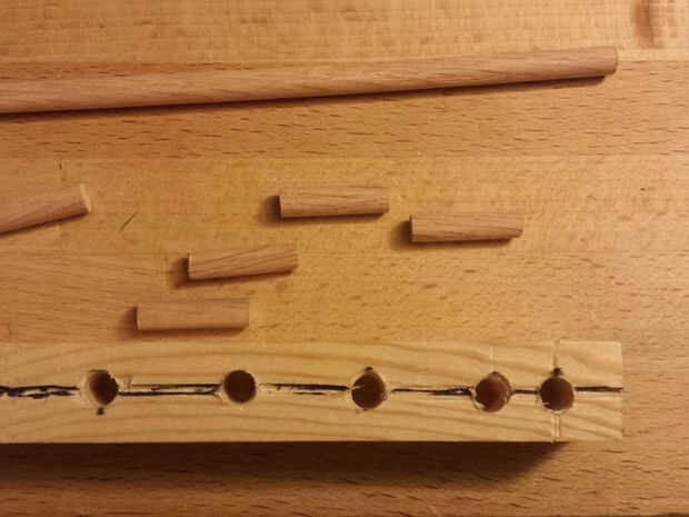 - Cortar 5 tiras de clavija de madera varilla de 1/4" y colocarlos en los agujeros