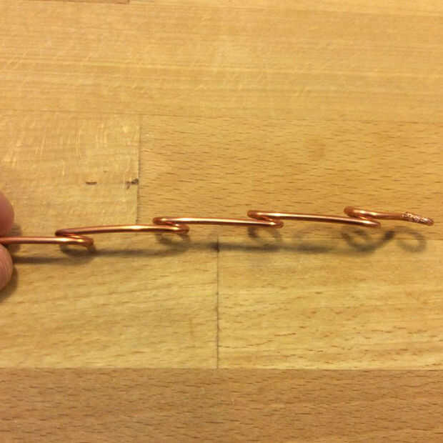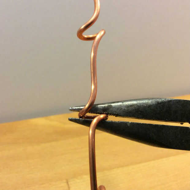 Al final, la pluma debe parecerse más o menos una línea recta. Utilice pinzas para ajustar los lazos de la guía de alambre paralelo, y enderezar el brazo si es necesario. Una vez más, de cobre es muy indulgente y con un poco de paciencia puede hacerla lucir bien.