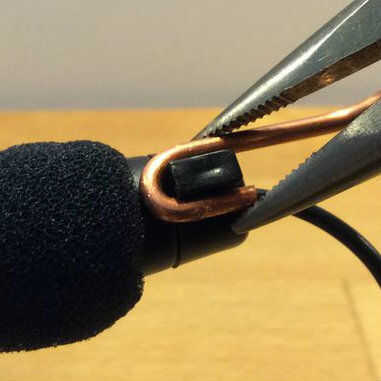 Nota: La pequeña lengüeta de plástico en el micrófono de solapa Neewer podría desprenderla fácilmente si se pone demasiada presión en el alambre. Si tienes problemas para conseguir el ajuste correcto, luego fijar el micrófono al alambre de boom con una gota de epoxy.