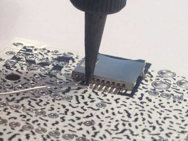 Nota: Parte inferior del zócalo de la tarjeta está hecha parcialmente de plástico. Aunque no está hecho de mantequilla y puede soportar calor, tenga cuidado con el soldador y tratar de no derretir el plástico. No puede insertar tarjeta SD o usar zócalo en absoluto, si lo hace.