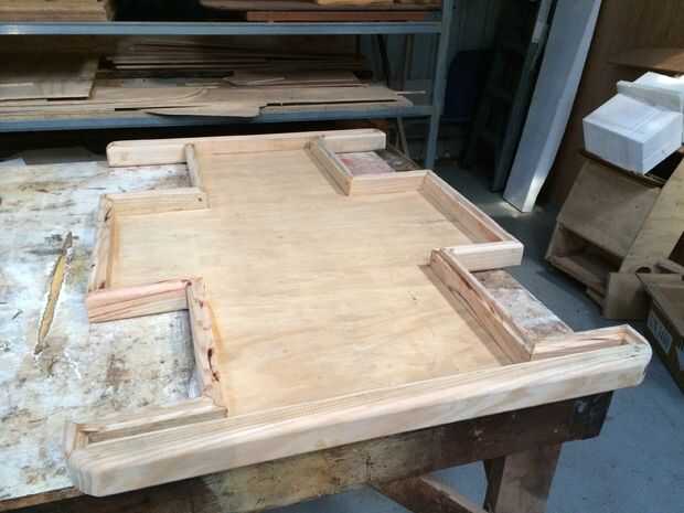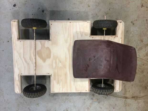 Estamos usando una capa superior e inferior y webs de pino y los bordes. El tamaño del kart siendo muy pequeña se ha adaptado para permitir que los paneles superior e inferior a partir de una hoja estándar de capas. Usando capas y pino mantiene los costos al mínimo y permite la fabricación muy simple.
