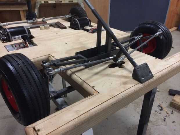 100mm de largo de brazos de dirección se sueldan con autógena a los cabecillas en las ruedas delanteras. El ángulo de los brazos de dirección se determina con las ruedas en plena inclinación (brazos de dirección no falta en el chasis para asegurar) y toma en cuenta principios manejo de Akermann.
