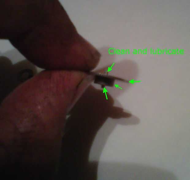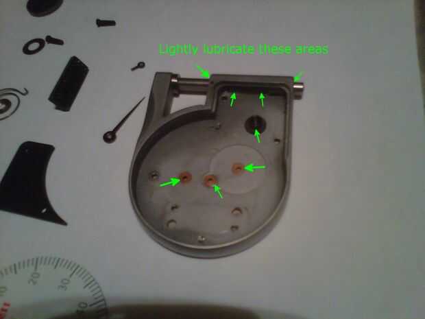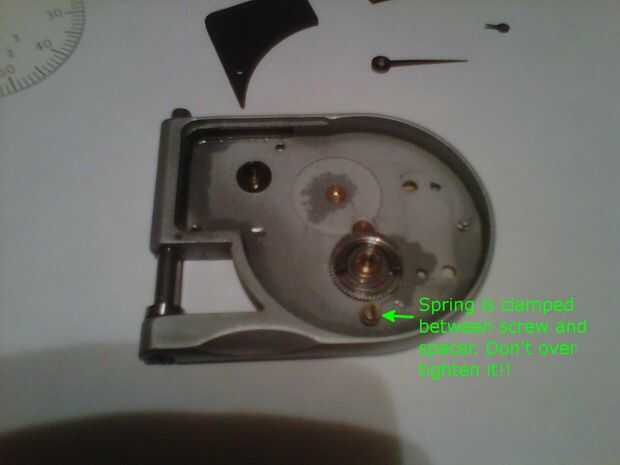 Lo que buscas, en extensión completa del micrómetro (la apertura más grande) es un resorte que está tensado, pero no para que las bobinas se solapan. Puede llevar hasta ese punto, pero si lo haces, detrás de unos dientes. Sosténgalo allí con la placa de soporte con un destornillador pequeño.