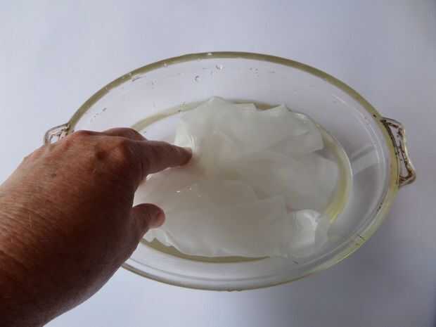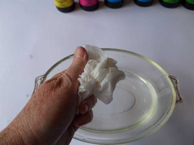 Colocar la seda en un recipiente con agua y luego extraer apretando firmemente. Es importante mojar la seda antes de teñir y colocar en el microondas, ya que evita que se para en seco y tintes se mezclan mejor.