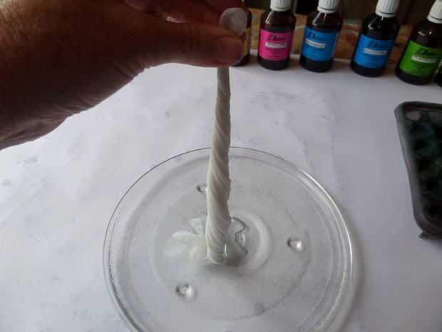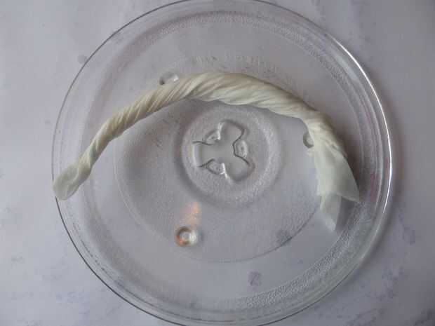 Agarrar la seda húmeda de la tela medio y giro en espiral, luego colocar en el plato de microondas limpio.