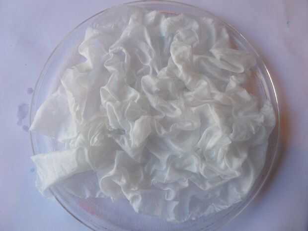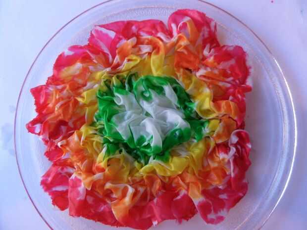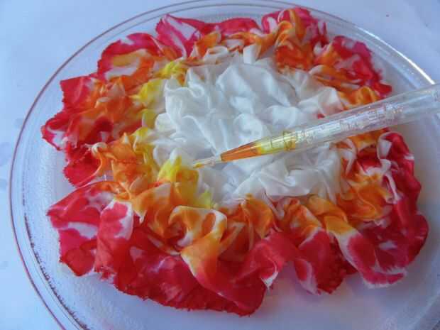 Primero humedezca la seda, utilice sus dedos para crujir la seda en el plato del microondas y luego aplicar las pinturas, utilizando las pipetas de plástico. Trate de no aplicar demasiado tinte como este puede estropear el efecto.