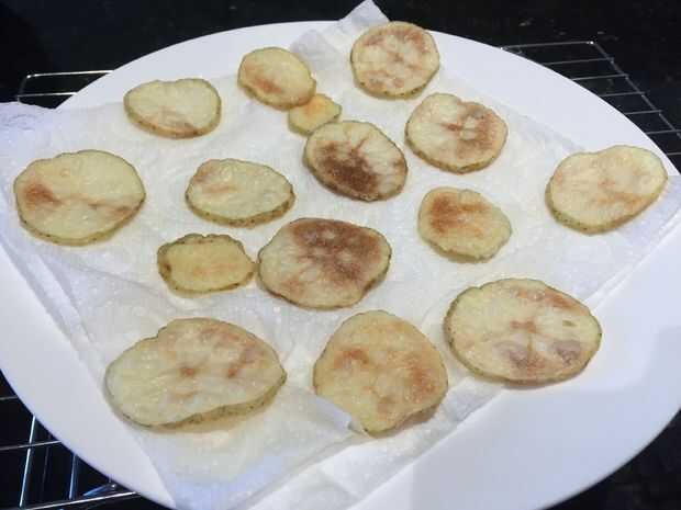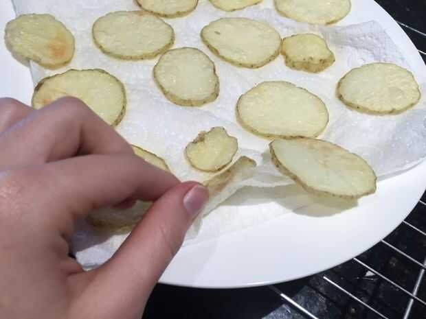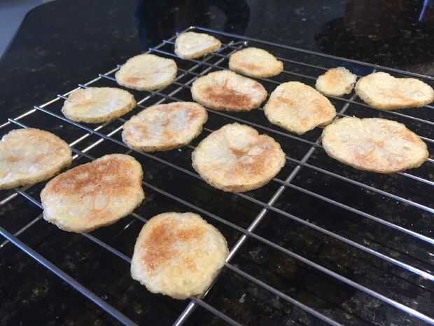 Sacar los chips y colocar un cable estante de enfriamiento. Todavía pueden ser un poco flojo en esta etapa, pero siempre y cuando se doran un poco que van a crips hasta. Si no coloque en el microondas un poco más.