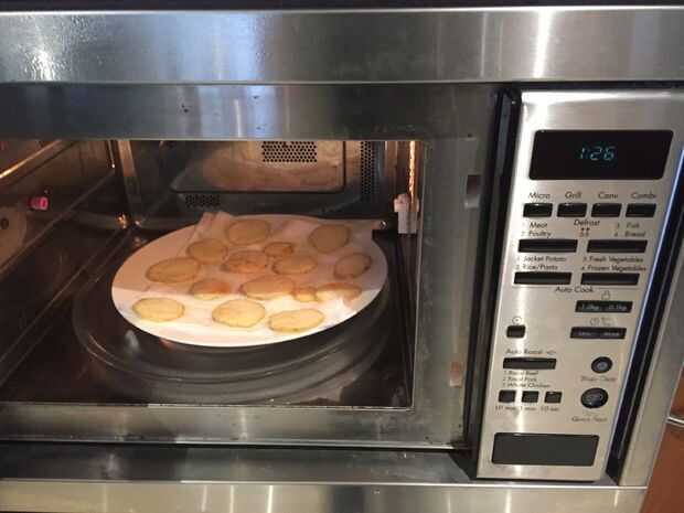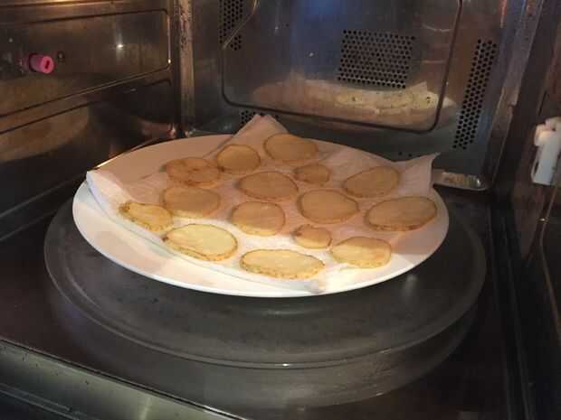 Coloque en el microondas en alto por unos 5-10 minutos hasta que van ligeramente marrón en los bordes. Esto depende de lo potente que es el horno de microondas. Después de 5 minutos si no han dorado mantener cocinarlos pero mantener un ojo sobre ellos ya que podrían quemar.