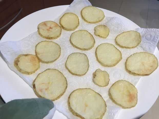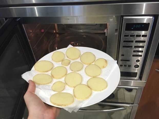 Una vez que las fichas se aderezan pone algunas toallas de papel en un plato de microondas grande seguro. O en lugar de toallas de papel papel para hornear si encuentras que los chips están pegando a la toalla de papel. Luego las papas uniformemente en la placa de la capa y añadir condimento adicional si así lo desea.