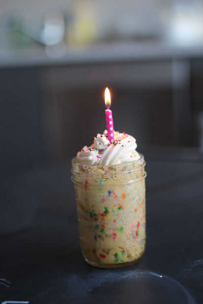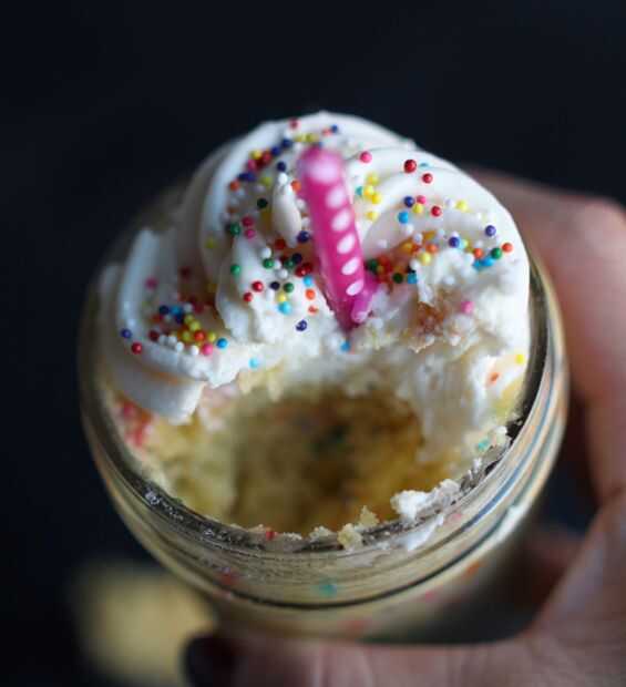 Funfetti, rocía aka, aka caramelo pedazos... todo lo que quieras llamarlos, son la Encarnación misma de la bondad dulce, celebración que asociamos con pastel de cumpleaños. Hoy en día, aquí les traigo un medio para literalmente tener su pastel y comérselo también, todo en menos de 5 minutos. sé, derecha!? Todo lo que necesitas es un tarro de masón (o taza), unos pasteles bien conocido fabricación de ingredientes y un horno de microondas.