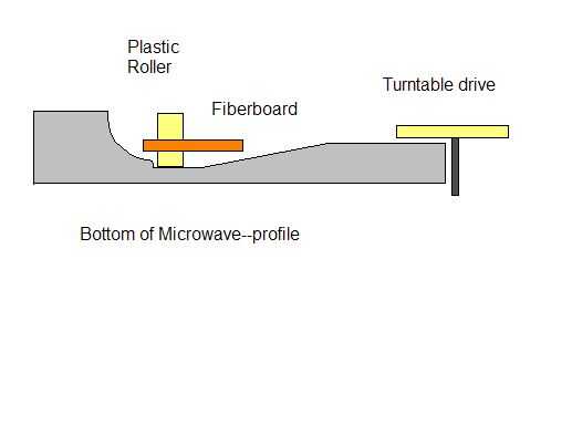Necesita saber el diámetro exterior del círculo que describen por los rodillos que gira en el tocadiscos. En este Instructable normalmente yo los remito a los rodillos de plástico blanco. Aquí una muestra en sección transversal como amarillo pálido para distinguir el rodillo de otros elementos en el gráfico. El fondo de microondas tiene subidas y caídas estampado en el metal, como ver aquí. Cuando te decides por diámetros internos y externos para el anillo que los rodillos de plástico, necesita evaluar cuánto espacio tienes para que el anillo no ata indebidamente entre el fondo de microondas y la bandeja giratoria de vidrio. Aquí se muestra una sección del anillo de fibra de madera en un color cobre. La unidad de plato giratorio está en el centro del anillo de fibra de madera y el plato giratorio. No siempre es fácil obtener una visión clara para medir cuando mirando en el microondas.