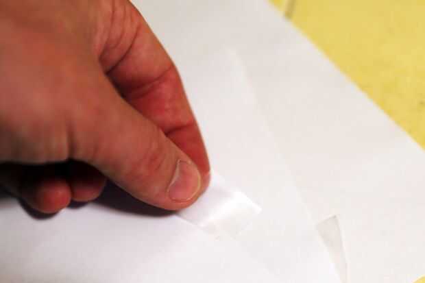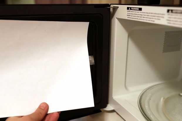 Con una cinta transparente aplicada a los bordes posteriores de la impresión del papel se une al interior de la puerta del microondas, asegurándose de que en la cinta los bordes contra la puerta para eliminar los vacíos.