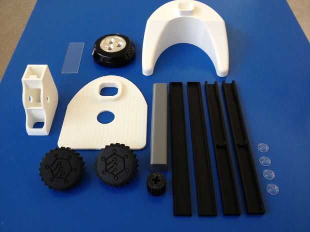 Usted tendrá que imprimir todos los componentes. Esto debería funcionar con una variedad de impresoras y la configuración. Lo imprimí en un Makerbot Replicator 2 utilizando PLA blanco, negro y plateado. Para el tubo óptico, rack, perillas, piñón, etapa y cabeza usé 0.1 mm, relleno de 15% y ajuste alto. Para el poste y soporte utilicé medio ajustes, 0.27 mm, relleno de 2,5%. Debe tener suficiente tolerancia para configuración media en todas partes. DST puede encontrarse en el archivo zip adjunto.