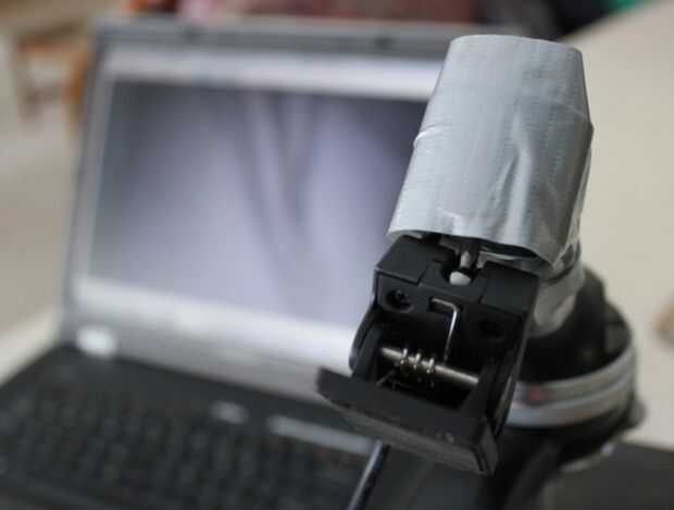 Aquí es donde la cinta americana. Conecte la cámara web en su a la madre de microscopio donde se extrajo el ocular.