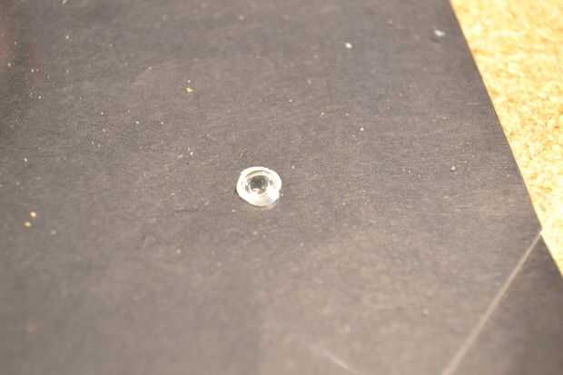 Para montar el lente tenemos perforar el acrílico mas grande, lo haremos centrado a 4 cm de distancia del borde. Utilizaremos una broca del tamaño del lente para quede justo (como ya teníamos las partes montadas, las desmontamos para taladrar mas cómodamente).