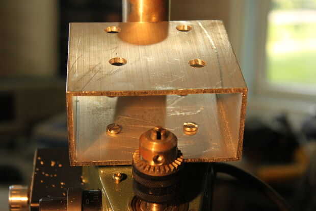 Montar la placa en el rectángulo de 4 x 8-32 x.5 pulgadas tornillos largos en las esquinas. Lentamente Levante el eje. El taladro debe chocar con la placa en la línea media. Si no, trate de deslizar el rectángulo golpeándolo con un martillo de goma o el mango de un destornillador. Si no se mueve, extraiga la placa, afloje los tornillos en el rectángulo y reajustar la posición del rectángulo. Una vez que el rectángulo quede debidamente colocado apriete los 4 tornillos que la sujetan a la prensa del taladro. Usted será no ser quitar el rectángulo otra vez.