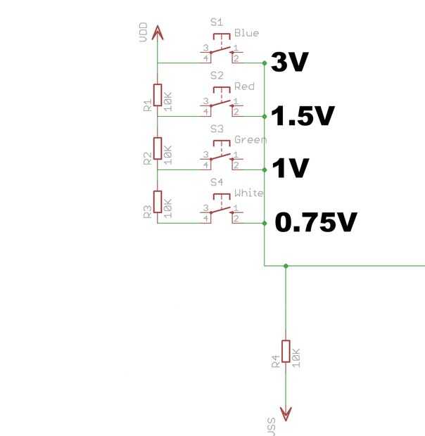 El diseño de hardware utiliza un truco de microcontrolador común de usar un solo perno de ADC (analógico al convertidor Digital) para conectar los botones de 4 colores del juego. Cada interruptor es conectado al controlador a través de un solo resistor 'desplegable' a la tierra que actúa como la mitad inferior del divisor de voltaje. La otra mitad del divisor de voltaje se crea mediante una red de resistencias de 10K en el otro lado de los botones. Dependiendo de qué botón pulsar conectar 0 ohmios, 10 K ohmios, ohmios de 20 K o 30 K Ohms a la mitad superior del divisor de voltaje. Utilizando algunas matemáticas simples ohmios-ley usted puede trabajar a la tensión para cualquier interruptor dado como se muestra en el siguiente diagrama:
