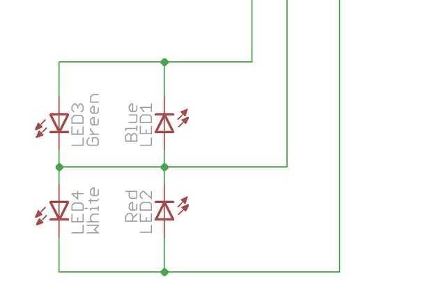 Los LEDs están conectados con el PIC mediante 3 pines. Esto se logra mediante el uso de 'charlieplexing' que se aprovecha del hecho de que un LED es un diodo y sólo permite corriente fluya en una dirección. Pernos de IO de la PIC son 'tri-state' significado pueden ser 0V (energía a tierra el hundirse), 3V (abastecimiento de energía de Vdd) o entradas de "alta impedancia" (de alta impedancia es una expresión de lujo lo que significa que efectivamente se desconecta el pin y prácticamente ninguna energía fluye a través de él). Mediante 3 pines es posible controlar hasta 6 LEDs, sin embargo el juego sólo requiere 4 como se muestra en el siguiente diagrama: