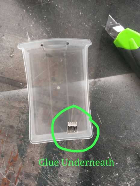 Dab algunas epoxi de dos partes en la parte inferior del conector USB (las lengüetas de la soldadura son la parte superior) e insértelo en el agujero. Utilicé una correa de la cremallera para garantizar así, pero no tienes que...