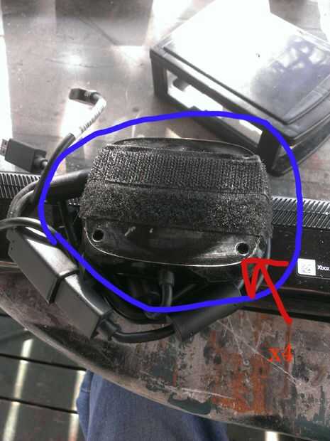 Desenroscar 4 (cuatro) tornillos debajo del Kinect, añadir Velcro sólo ligeramente más largo que la longitud de la base, incluyendo el borde curvado, doblar sobre el borde y luego vuelva a enroscar la tapa, (más apoyo para el Velcro) añadir un par de piezas en la parte superior del cajón.