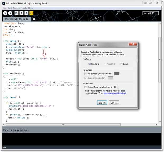 He conectado un archivo pde a este tutorial, por lo que está listo para descargar y cargar en "procesamiento 2" IDE. Una cosa hay que actualizar es una adecuada COM puerto que su usa MicroView (ver una flecha en la imagen adjunta).