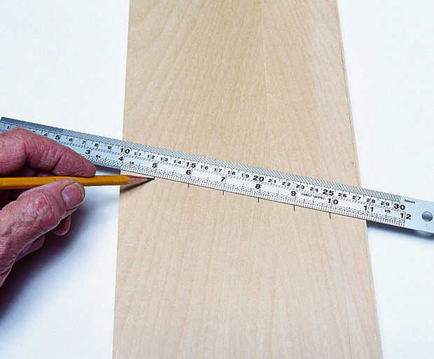 Un método similar se utiliza para encontrar el centro de la Junta. Ángulo de una regla a lo ancho de la Junta para que sea un número entero de la regla en cada borde de la pieza de trabajo. Encontrar el punto medio entre los dos números y marca ahí (Foto 2). Con cualquier método, no importa si se coloca el extremo de la regla en el borde de la Junta o si se utiliza el medio de la regla.