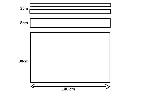 Cortar 2 tiras de 3 cm x 140 cm para las correas. 1 tira de 8 cm x 140 cm para formar una colmena. 1 rectángulo 80 cm x 140 cm para hacer la falda.