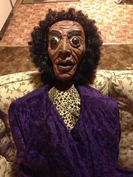Siguiente reuní la cabeza de "maniquí" a partir de la 2 º máscara y peluca, se adhirió a la cabeza de espuma con pegamento caliente. Luego hueco de un agujero en la base del cuello de la cabeza de espuma y había asegurado la percha doblada en la cabeza de espuma con cinta adhesiva. Para construir el cuerpo "dummy" aplanado una caja y adjunto el soporte para el área superior del hombro del maniquí e insertan varillas para estabilidad en forma de x dentro de la caja entonces lo todo con cinta aislante. Pegamento caliente fue utilizado en la obtención de un torso bajo a mediados de la correa del maniquí para fijarse alrededor del pecho para la estabilidad. Luego adjunta el traje al maniquí torso y rellenos de los hombros, los brazos y guantes con relleno de fibra.