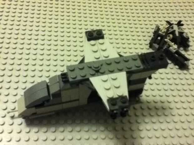 hice un LEGO Halo UNSC Falcon/Pelican artillado. Tiene el tamaño y ala forma de un pelícano mezclado con el cuerpo y fuego energía de un halcón mezclada en una nave. La nave de la pistola puede acomodar hasta 10 mini figuras de max con dos principale