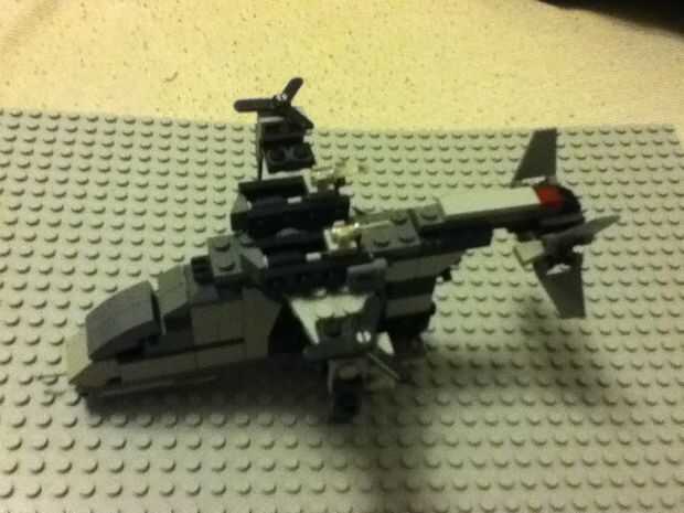 hice un LEGO Halo UNSC Falcon/Pelican artillado. Tiene el tamaño y ala forma de un pelícano mezclado con el cuerpo y fuego energía de un halcón mezclada en una nave. La nave de la pistola puede acomodar hasta 10 mini figuras de max con dos principale