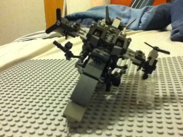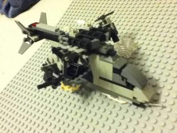 hice un LEGO Halo UNSC Falcon/Pelican artillado. Tiene el tamaño y ala forma de un pelícano mezclado con el cuerpo y fuego energía de un halcón mezclada en una nave. La nave de la pistola puede acomodar hasta 10 mini figuras de max con dos principale