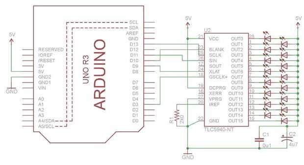Para el control de 12 LEDs (12 notas musicales básicas) utilizar un controlador de LED, en este caso, TLC5940.