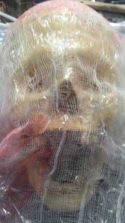 Tercer paso-Ponga el tejido de elección sobre el cráneo. Usé gasa sanguinolenta desde el almacén del dólar para éste. Funcionará cualquier tela de peso ligero. Si usted está usando algo más gruesa que una gasa utilizaría más pegamento en la mezcla.
